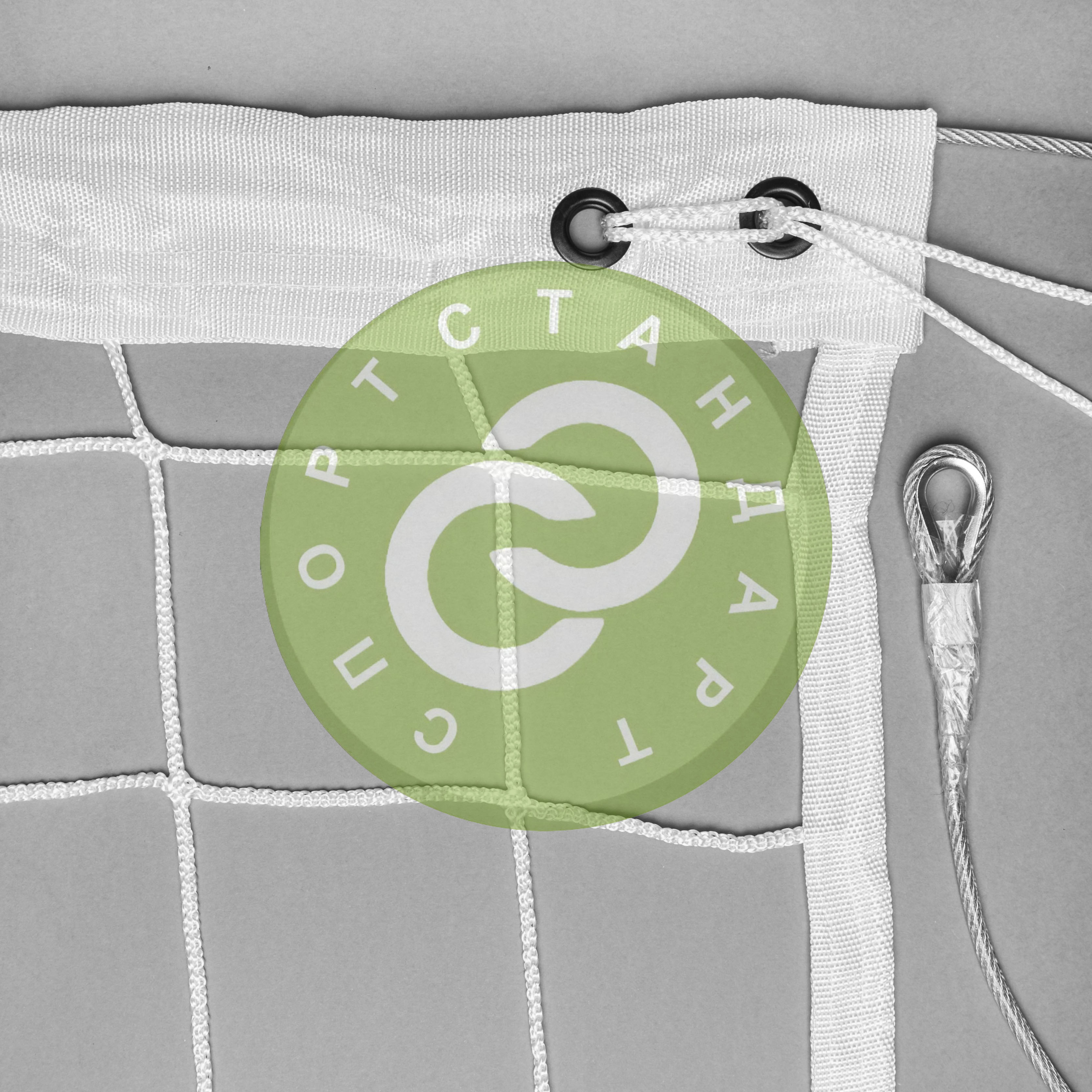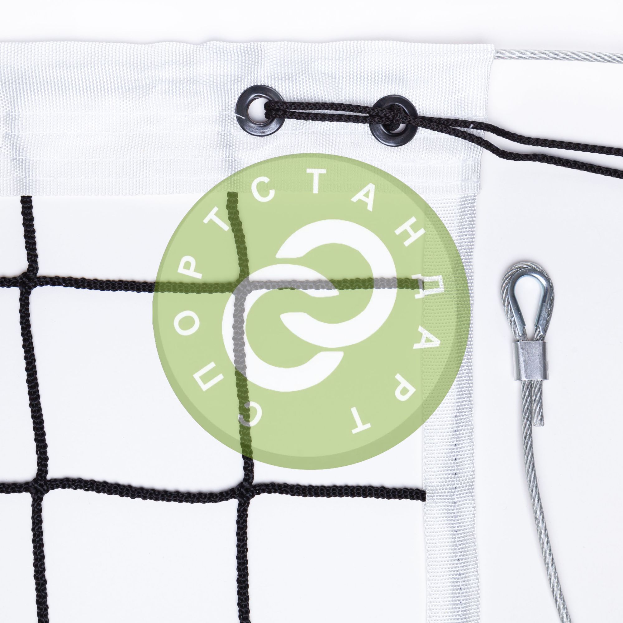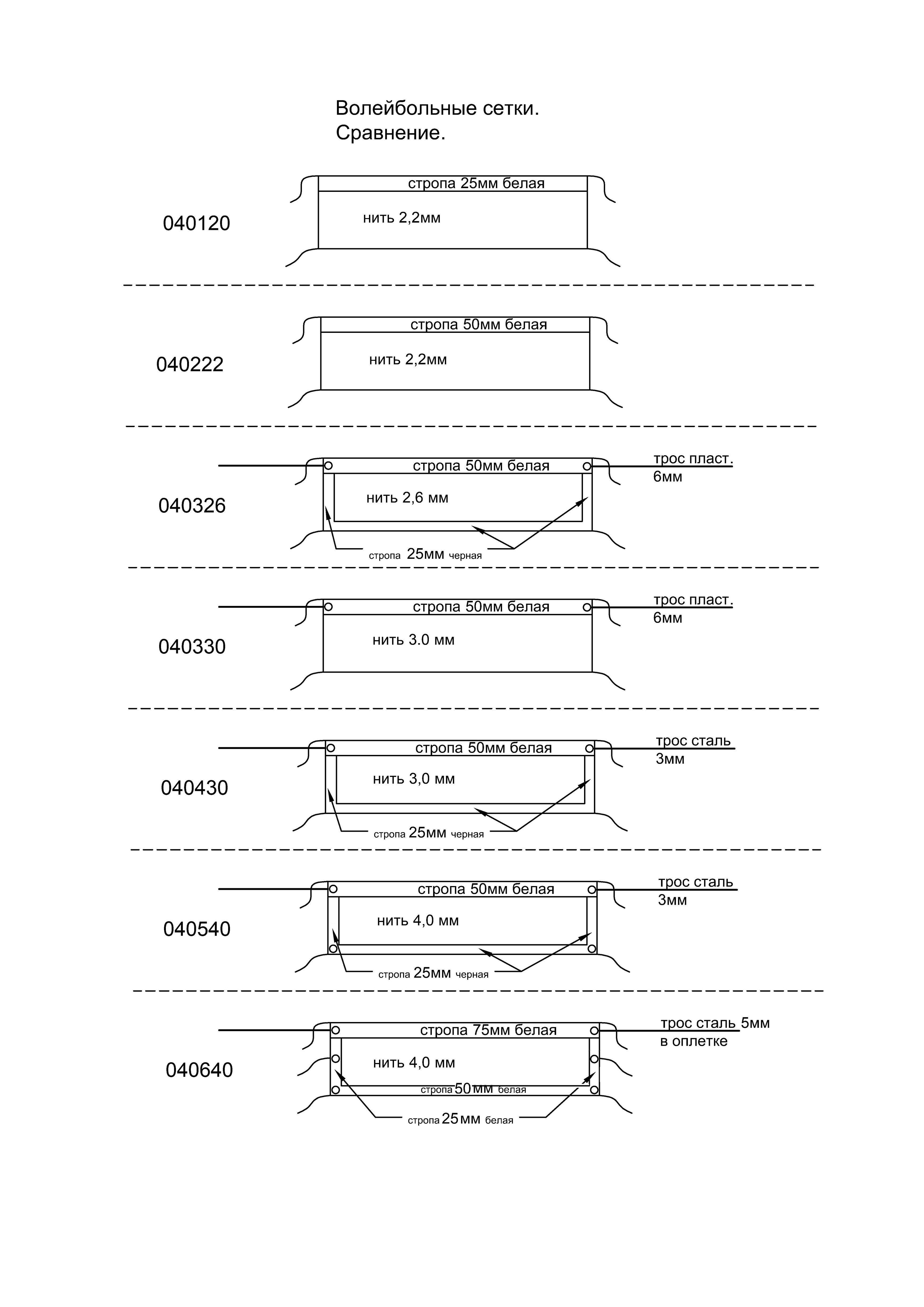 Для производства изделия взята нить толщиной 4 мм. Волейбольная сетка оснащена подвязками, люверсами, стальным тросом 5 мм в оплетке. Стропы 150, 100 и 50 мм, сложенные пополам