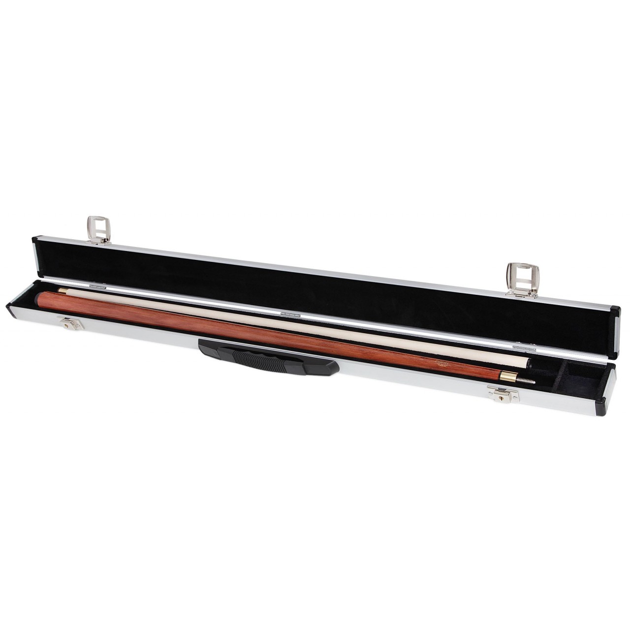 Внутри кейса расположено три отделения, покрытых мягкой тканью — для турняка кия, шафта и мелких аксессуаров. Корпус из алюминия серебристого цвета защищает кий от любых дорожных неприятностей, он легко чистится, устойчив к ударам и царапинам. Для транспортировки имеется удобная выдвижная рукоятка черного цвета. Закрывается кейс на 2 металлических замка.