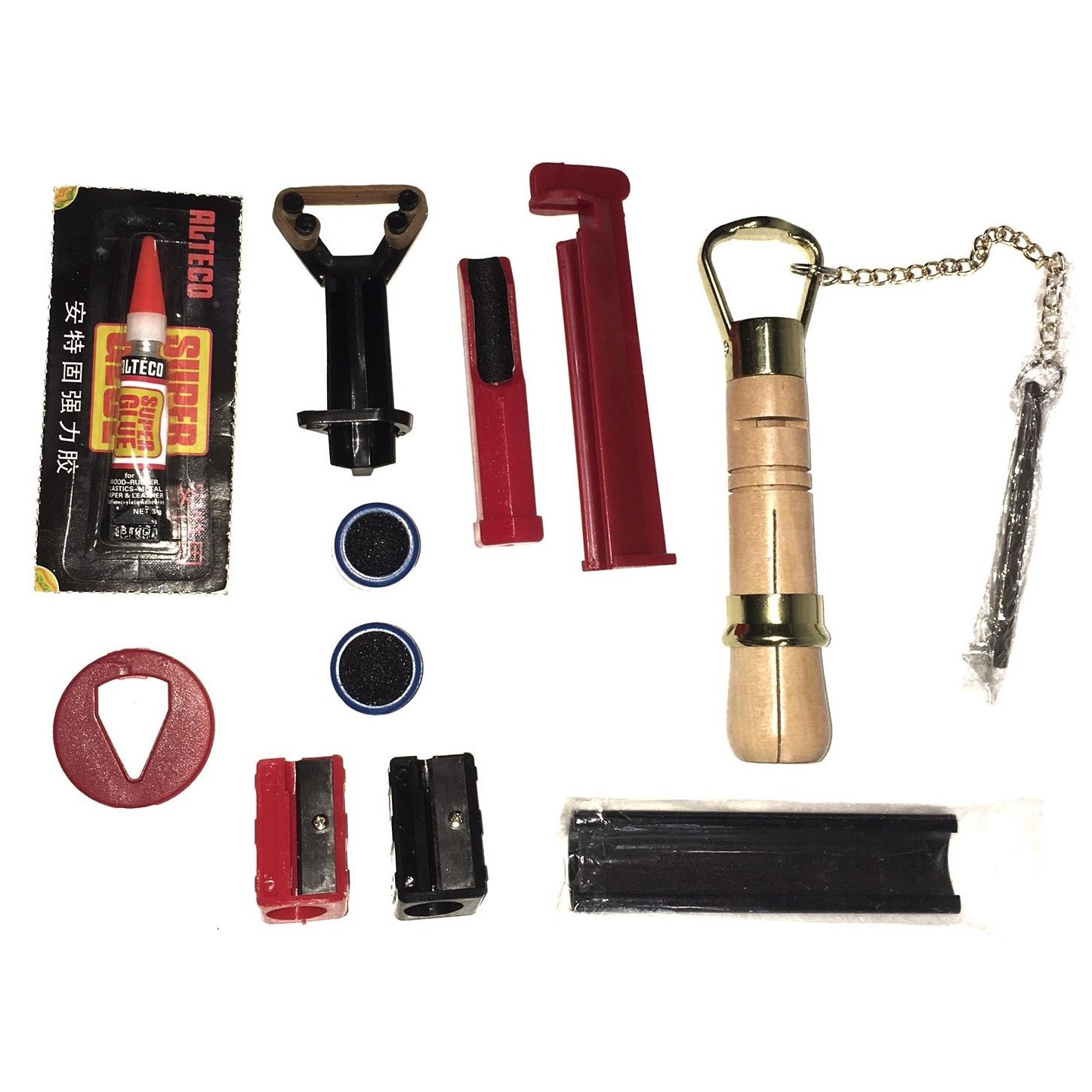 Мел - 6 шт., Наклейки 13 мм - 6 шт., Клей для наклеек, 10 г - 1 шт., Фиксатор для наклейки - 1 шт., Инструмент для обработки наклейки - 1 шт., Триммер - 1 шт., Колпачки для кия 12 мм - 4 шт.