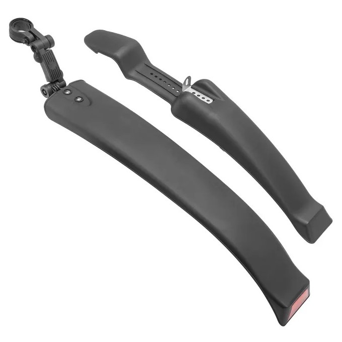 Оба крыла выполнены из прочного пластика, имеют широкую форму и подходят под колеса 24-26". Переднее крыло крепится на кронштейн к вилке, заднее - на хомут к подседельному штырю. Заднее крыло имеет светоотражающий элемент и его наклон можно быстро отрегулировать без инструментов. Цвет: черный.